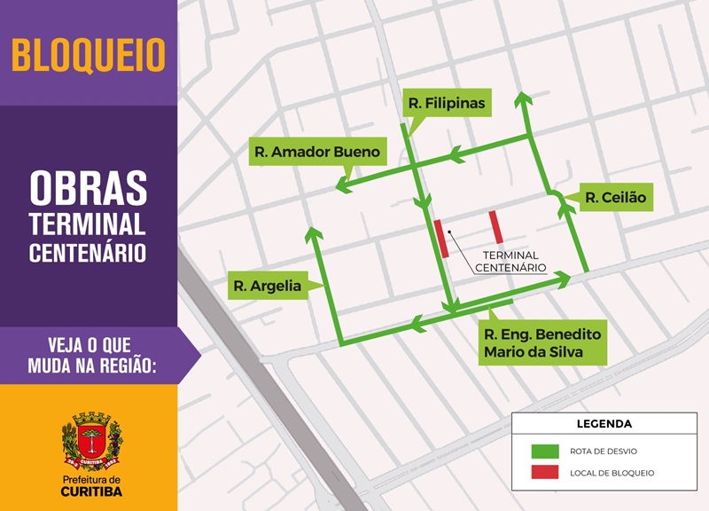 A partir da próxima segunda-feira (20/10), ruas do entorno do Terminal Centenário, no bairro Cajuru, vão ser temporariamente bloqueadas para obras de pavimentação do Lote 4.1 e 4.2 do BRT Leste/Oeste.