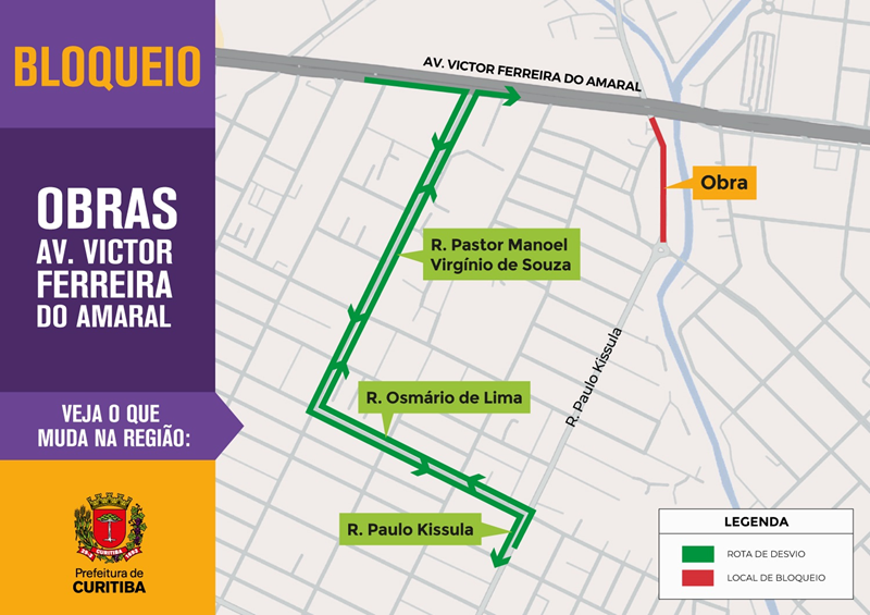 As ações realizadas no local integram o pacote de obras do PRO Curitiba, que prevê o investimento de mais de R$ 6 bilhões nos próximos quatro anos, em obras de infraestrutura urbana no município. A interrupção é necessária para os trabalhos de escavação e recomposição do pavimento, que incluem o ajuste do nível da Avenida Victor Ferreira do Amaral e o encaixe com a altura da Rua Paulo Kissula. A previsão é que os trabalhos no local sejam concluídos até agosto de 2026.