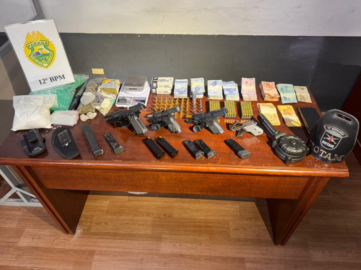 O responsável pela casa assumiu a propriedade dos entorpecentes e afirmou possuir armas registradas. Em buscas no imóvel, a equipe encontrou uma pistola calibre 9 mm com carregador e munições no quarto da criança, além de outra pistola 9 mm com três carregadores de 17 munições cada, uma pistola calibre .32, grande quantidade de munições, acessórios táticos, uma faca e mais embalagens para venda de drogas. Também foram apreendidos 593 gramas de cocaína em saco plástico, 64 gramas da mesma substância acondicionadas em pinos, 320 gramas de maconha prensada, 44 gramas de “murruga” e 14 gramas de crack.