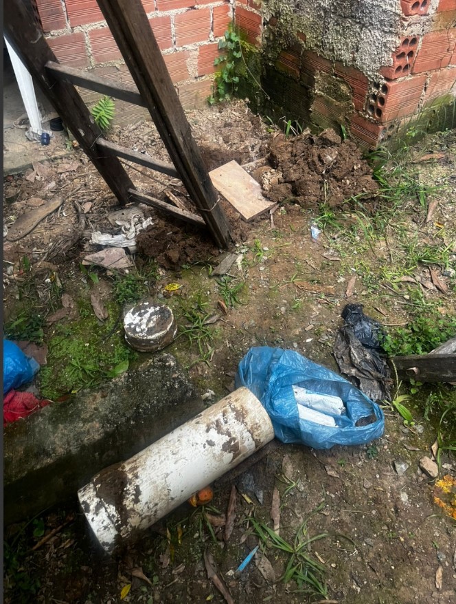 Na área externa, os policiais notaram um ponto de terra remexido. Dentro de um cano de PVC enterrado, localizaram uma emulsão explosiva encartuchada de 1,3 kg, removida posteriormente pelo Esquadrão Antibombas.