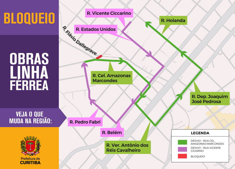 Como desvio, veículos que estiverem na Rua Cel. Amazonas Marcondes, no sentido Rua Vicente Ciccarino, deverão virar à direita e seguir pela própria Cel. Amazonas Marcondes até a via rápida da Rua Belém, podendo continuar em frente ou acessar à esquerda a Rua Ver. Antônio dos Reis Cavalheiro, depois à esquerda na Rua Joaquim José Pedrosa, seguindo até a Rua Holanda, com possibilidade de retorno à Rua Vicente Ciccarino.