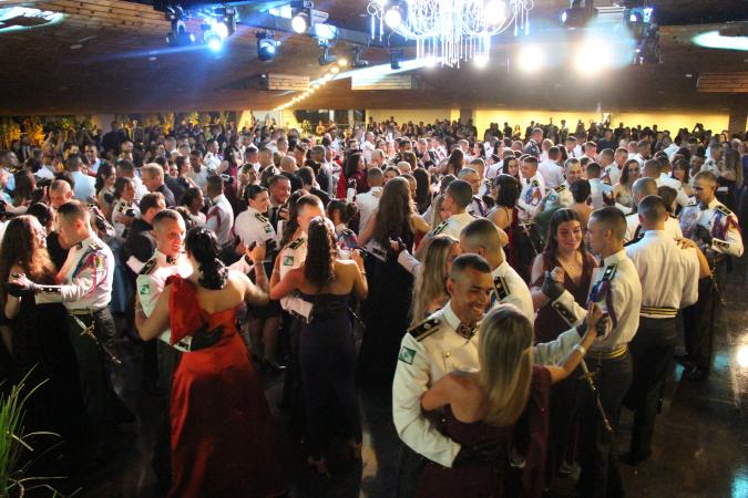 Na noite desta sexta-feira (24), o Clube Santa Mônica, em Colombo, foi o cenário do tradicional Baile do Espadim, reunindo os 101 cadetes do 1º ano do Curso de Formação de Oficiais da Polícia Militar do Paraná (PMPR). O evento festivo integrou as solenidades iniciadas durante a manhã com a entrega do Espadim Tiradentes na Academia Policial Militar do Guatupê, simbolizando um importante passo dos alunos na trajetória rumo ao oficialato da corporação.