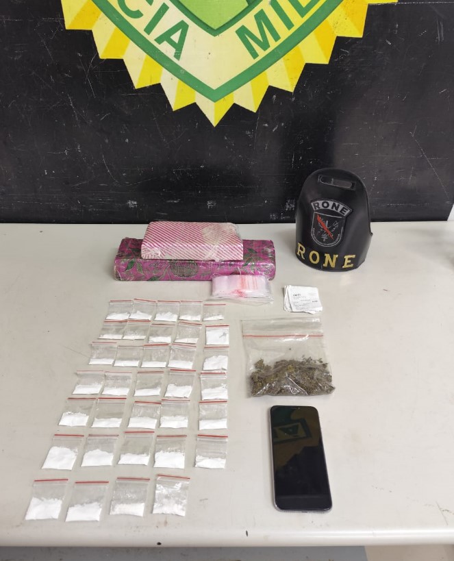 Durante a fuga, o suspeito arremessou vários invólucros contendo substância análoga à ketamina. Em buscas posteriores na residência, foram localizados 1,3 quilo de maconha e 20 gramas de capulho (maconha prensada).