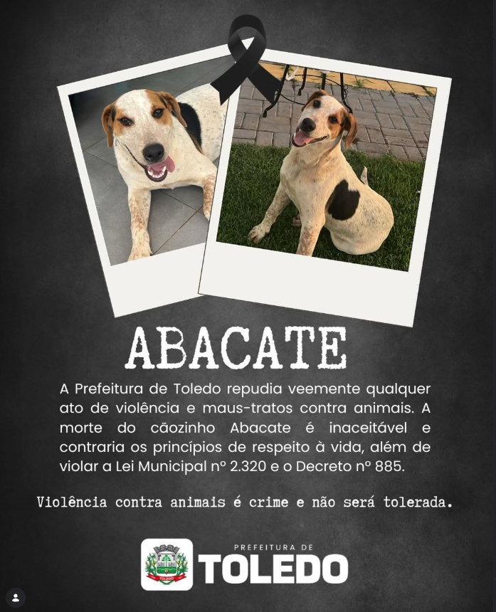 O cão Abacate foi morto nesta terça-feira (27) com um tiro de arma de fogo no bairro de Tocantins, na cidade de Toledo, Paraná. Segundo informações da polícia, a bala atravessou o corpo do animal, atingindo os rins.