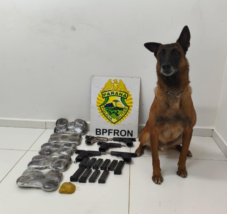 Uma ação do Batalhão de Polícia de Fronteira resultou na apreensão de drogas e armas durante abordagem a um ônibus interestadual na quinta-feira (9), em Guaíra, no oeste do Paraná. A fiscalização ocorreu em um posto da Polícia Rodoviária Federal, com apoio do Pelotão de Operações com Cães. Durante a vistoria, o cão de faro Ollie indicou duas passageiras que viajavam juntas.