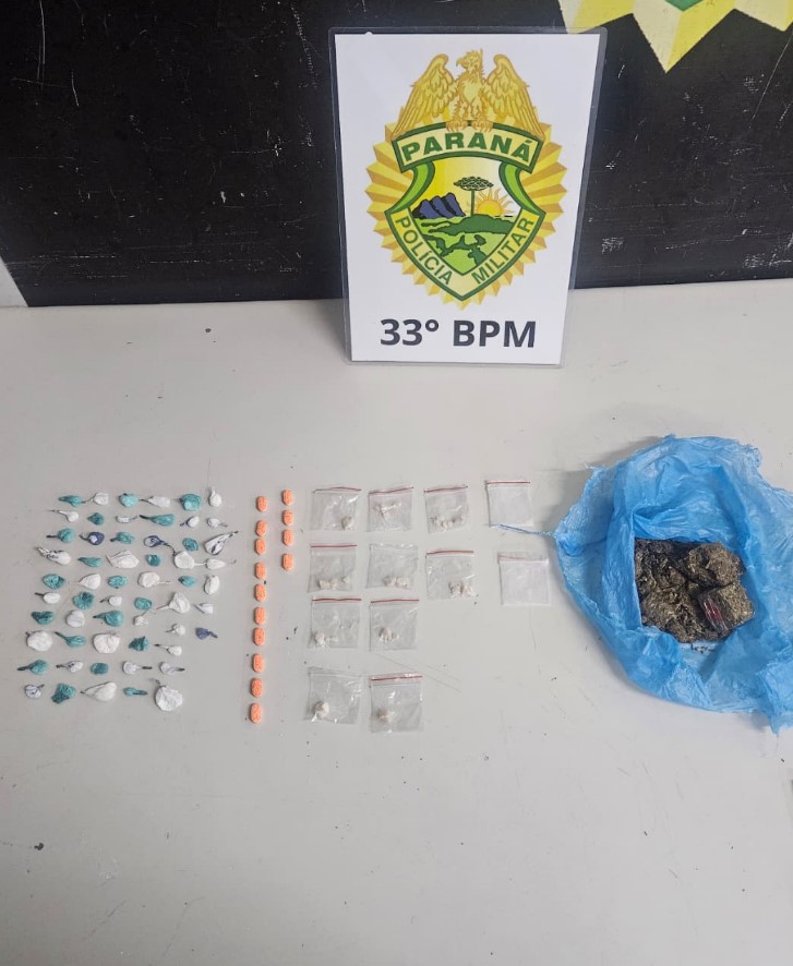 Com a mulher, a equipe encontrou porções de cocaína e dinheiro. Já com o homem foram localizados comprimidos de ecstasy. Em continuidade às diligências, os policiais verificaram o interior da grade metálica onde a suspeita havia mexido instantes antes, localizando mais invólucros com drogas variadas.
