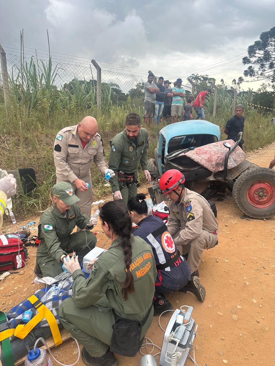 Outra vítima, um homem de 40 anos, permanecia presa às ferragens de um dos veículos. Ele apresentava trauma abdominal grave e fratura exposta na perna esquerda. Após atendimento avançado no local, também foi removido de helicóptero até o Hospital Cajuru, em uma ação que contou com o apoio da tripulação do Patrulha 15 da Polícia Rodoviária Federal, acionada pela gravidade e pela quantidade de feridos.