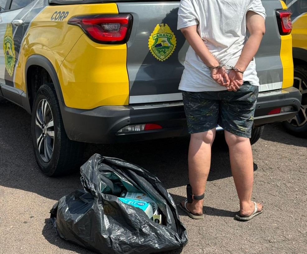 Com base nas características informadas, as equipes intensificaram o patrulhamento e localizaram dois suspeitos na Rua Gastão Poplade. Ao perceberem a aproximação da viatura, ambos tentaram fugir. A mulher foi abordada, enquanto o homem conseguiu escapar por uma área de difícil acesso. Durante buscas nas proximidades, foi localizado, escondido embaixo de um veículo estacionado, um saco plástico contendo os produtos roubados.