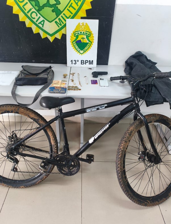 Durante patrulhamento na região, os policiais visualizaram um indivíduo com as características repassadas, transitando de bicicleta. Foi dada voz de abordagem e, durante a revista, foram localizados os objetos roubados, além de um simulacro de arma de fogo utilizado na ação. Entre os itens recuperados estavam um iPhone 14 Pro, um cartão bancário, uma corrente, um relógio e uma carteira com dinheiro.