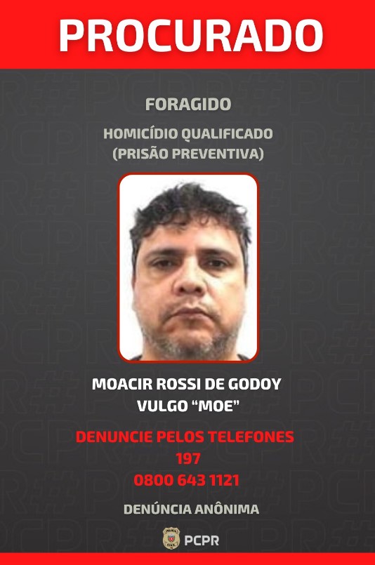 A Divisão de Homicídios divulgou nesta quarta-feira (18) a foto do Moacir Rossi de Godoy, de 41 anos, conhecido por “Moe”, foragido pelo homicídio de Hiago Martins Pinheiro, de 25 anos.