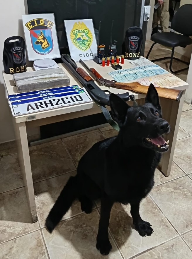 Com apoio da equipe CIOC e do cão de faro Faruk, foram localizadas duas espingardas, uma calibre 12 e outra calibre .22, sete munições intactas, duas deflagradas, 27 munições calibre .22, 1,6 kg de maconha, dois rádios comunicadores, uma balança de precisão, duas placas veiculares adulteradas e R$ 4.930,00 em dinheiro.