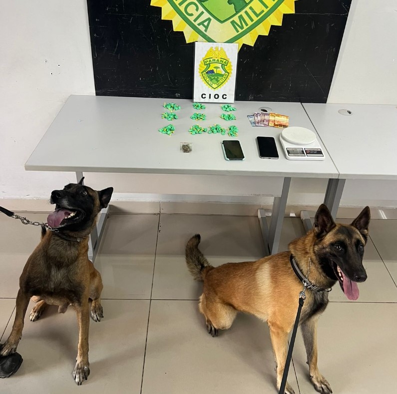 Na sequência, os policiais foram até outro endereço apontado como depósito de drogas. No imóvel, o cão Kolbi também indicou positivamente para entorpecentes, sendo localizadas mais porções de cocaína e uma balança de precisão.
