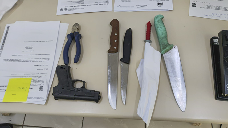 Já na segunda ocasião, a equipe foi acionada pela Central de Operações que recebeu uma denúncia sobre dois indivíduos em atitude suspeita em uma residência, na Vila Guaíra. A equipe se dirigiu até o endereço informado, onde encontrou um dos suspeitos fora da casa e outro dentro, portando simulacros de armas de fogos, facas e fios elétricos já retirados da residência. Um dos suspeitos tinha dois mandados de prisão em aberto.