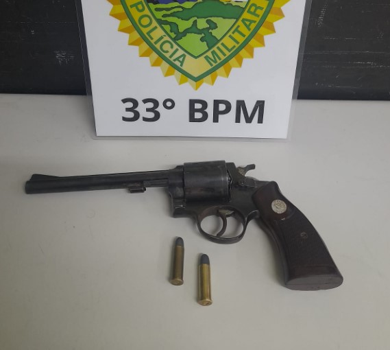 A equipe realizou a abordagem e, durante a busca no trajeto percorrido pelo suspeito, localizou um revólver calibre .38 com duas munições intactas dentro de uma lixeira. Questionado, o homem confessou ter tentado se desfazer da arma ao perceber a presença da Polícia Militar.
