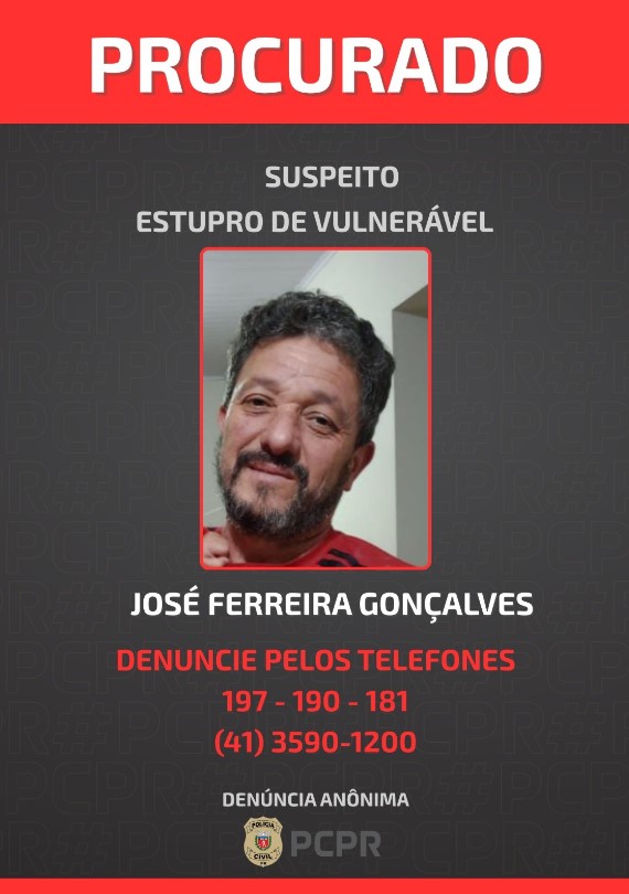 A Polícia Civil está a procura de José Ferreira Gonçalves, 57 anos, suspeito de abusar e engravidar uma menina de 11 anos em Piraquara, na região metropolitana de Curitiba. De acordo com a criança, ela teria sido ameaçada por José, que é amigo da família, inúmeras vezes, para que ela não falasse nada para ninguém sobre os estupros.