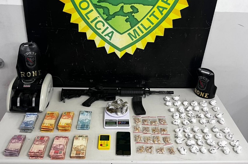Os policiais receberam informações sobre um endereço utilizado para o armazenamento e a venda de drogas. No local, o suspeito foi abordado e, durante as buscas, foram encontradas diversas porções de cocaína, crack e maconha, além de grande quantidade de dinheiro trocado e um simulacro de fuzil.