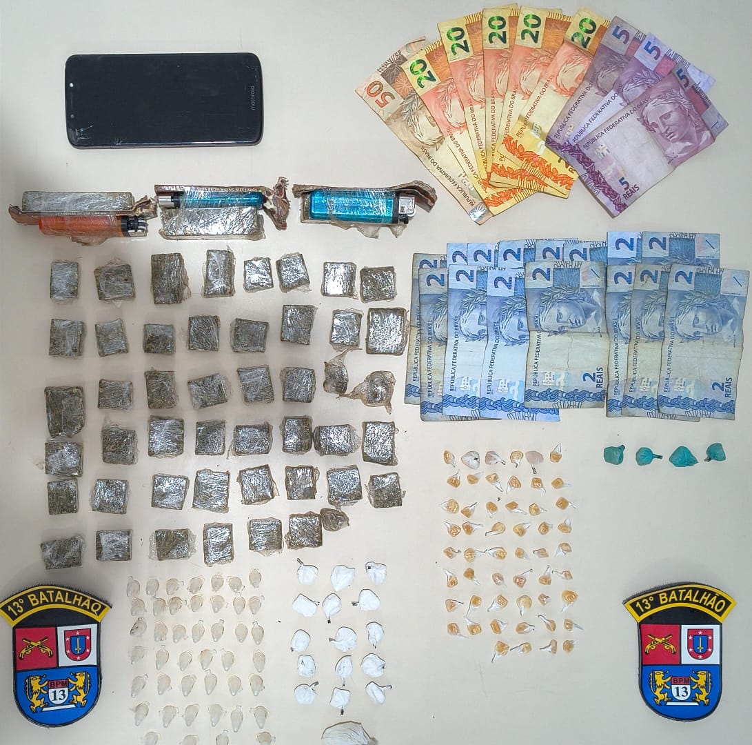 Em buscas complementares, a equipe localizou 59 pinos de cocaína (50 g), 50 porções de maconha (234 g), 56 pedras de crack (13 g), além de três kits com tabletes de maconha, seda e isqueiro, e R$ 191 em dinheiro provenientes do tráfico.