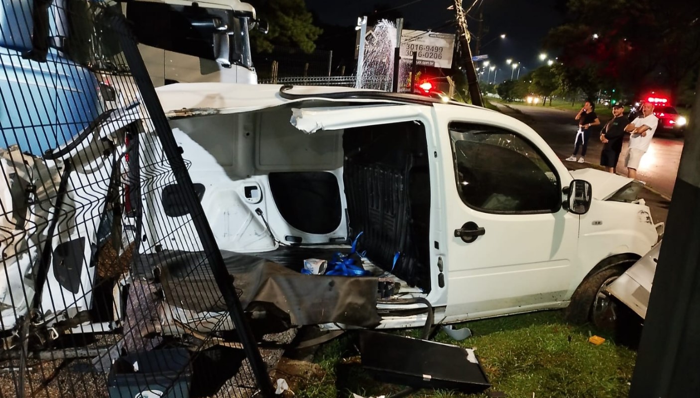 O condutor de um Fiat Doblô se envolveu em um grave acidente no início da madrugada deste domingo (18), na marginal da Linha Verde, no bairro Pinheirinho em Curitiba. O motorista seguia na pista sentido Colombo, quando na esquina com Rua Cid Marcondes de Albuquerque perdeu o controle da Doblô, colidiu e derrubou um poste e invadiu o pátio de uma empresa de caminhões, veja o vídeo: