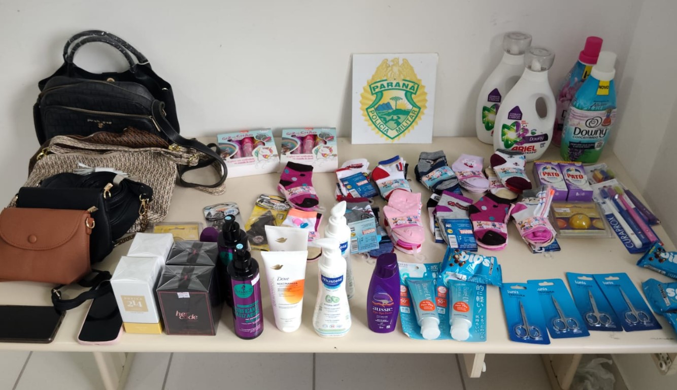 Duas mulheres foram presas por policiais militares do 29° Batalhão após serem flagradas com diversos produtos furtados de estabelecimentos comerciais no Centro de Piraquara, na Região Metropolitana de Curitiba, nesta terça-feira (7).
