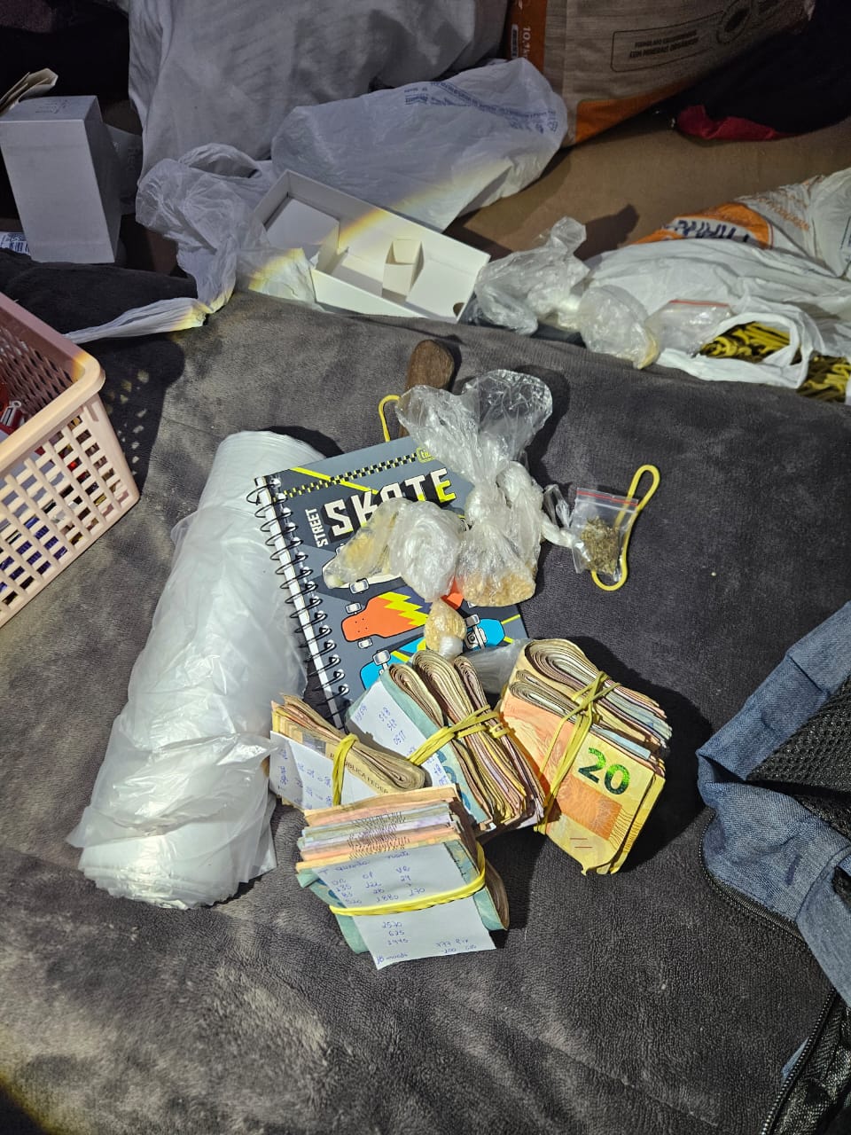 Na sequência, em diligência realizada na residência do investigado, situada no bairro Bonfim, foram encontrados mais entorpecentes, além de dinheiro em espécie, anotações relacionadas ao tráfico, dois aparelhos celulares, utensílios utilizados para acondicionamento da droga e outros objetos que reforçam a prática criminosa.