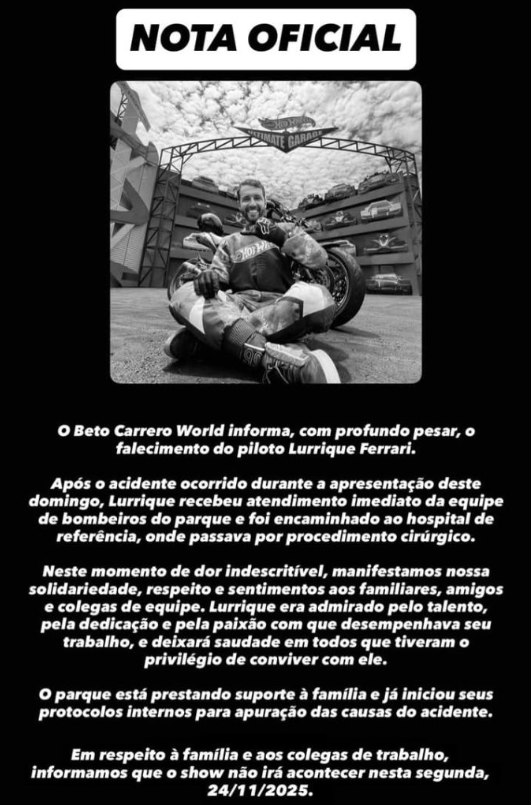 O piloto Lurrique Ferrari morreu após um grave acidente durante um espetáculo de motocicletas no Beto Carrero World, em Penha, no Litoral Norte de Santa Catarina. A ocorrência foi registrada na tarde deste domingo (23) durante o show “Hot Wheels Epic Show”.