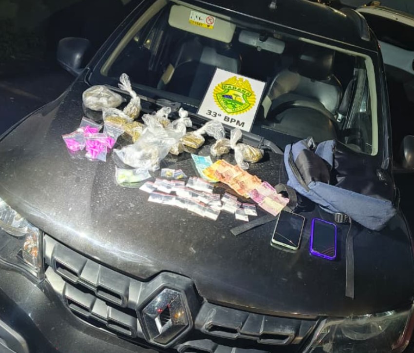Na busca veicular, foram encontradas diversas porções de entorpecentes, incluindo maconha, cocaína, cetamina e comprimidos de ecstasy, além de dinheiro em espécie e dois aparelhos celulares, itens frequentemente associados ao tráfico.