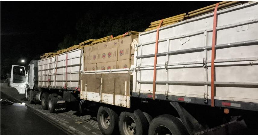 Durante a vistoria no compartimento de carga, as equipes visualizaram, por meio das aberturas de escoamento, caixas de papelão contendo cigarros. Questionado, o condutor, de nacionalidade estrangeira, confirmou que transportava grande quantidade do produto oriundo do Paraguai, sem a devida regularização fiscal.