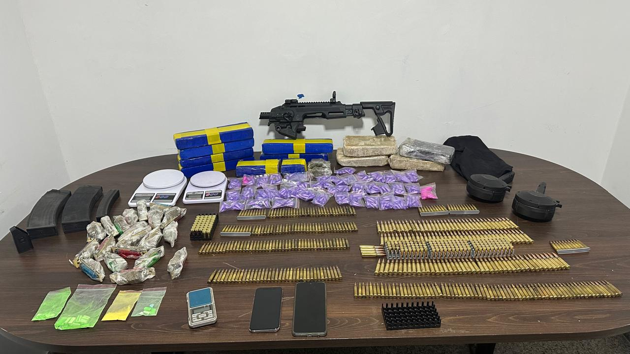 No total, foram apreendidas 572 munições de diversos calibres, sendo 268 de 5.56, 120 de 7.62, 147 de 9 mm e 37 de .45, além de dois carregadores caracol 9 mm, um carregador alongado 9 mm, dois carregadores calibre 12 e um dispositivo que permite transformar uma pistola comum em uma arma de maior estabilidade e precisão. Também foram localizados 3 quilos de crack, 5,9 kg de maconha, porções de cocaína e ecstasy, três balanças de precisão e duas balaclavas.