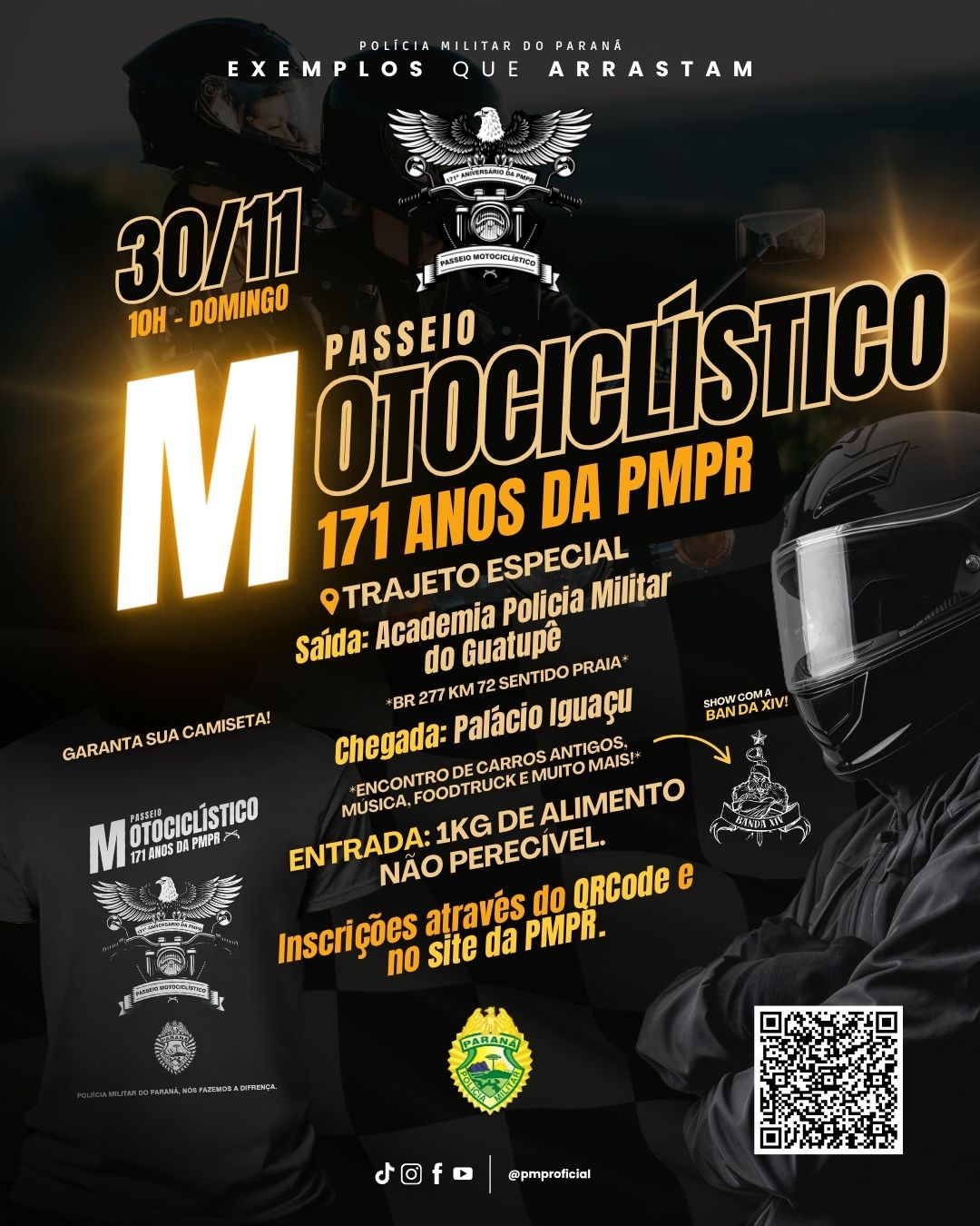 A Polícia Militar do Paraná (PMPR) celebrará seu 171º aniversário com um grande Passeio Motociclístico no próximo dia 30 de novembro (domingo), em Curitiba. O evento é aberto a toda a comunidade e busca promover a integração entre a corporação e a sociedade paranaense.