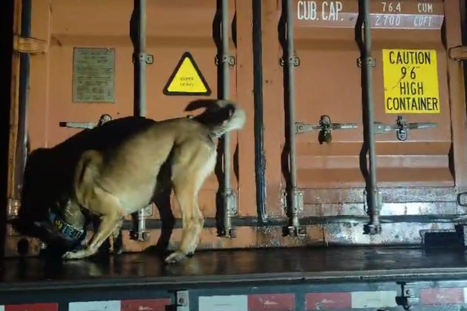 Devido à origem suspeita dos veículos, o cão farejador Máximus foi utilizado na fiscalização. No primeiro caminhão, que estava vazio, nada foi encontrado. Na sequência, durante a inspeção do segundo veículo, o cão deu indicação positiva em uma das caixas de papelão, que o condutor havia aberto.