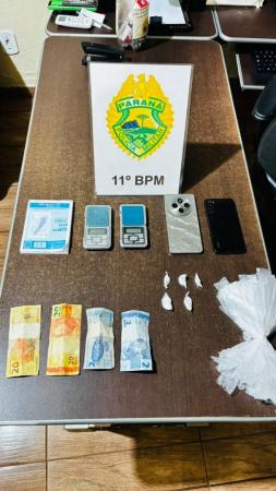 Na noite de sábado (11), por volta das 21 horas, a Polícia Militar do Paraná (PMPR), através de equipes do 11ºBPM (Batalhão de Polícia Militar) durante patrulhamento, visualizou um veículo em atitude suspeita, conduzido por indivíduo já conhecido no meio policial por envolvimento com o tráfico de drogas. Ao perceber a presença da equipe, foi possível observar o condutor arremessando um objeto em direção à passageira, o que motivou a abordagem.