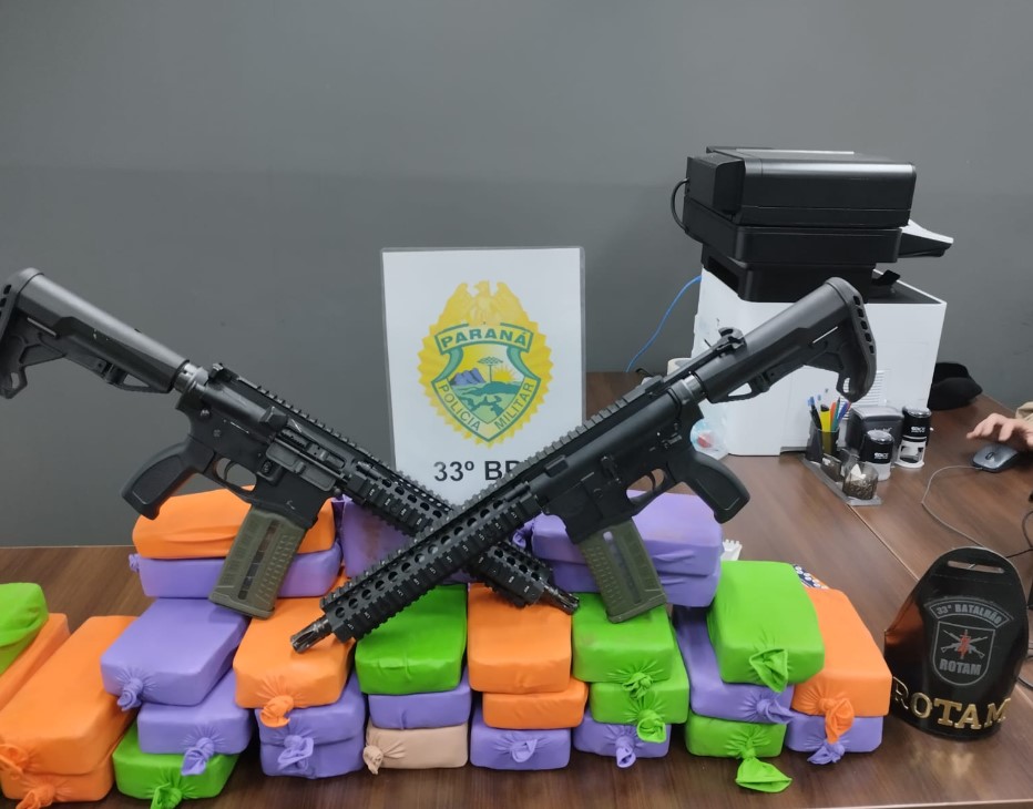 O motorista de um dos caminhões demonstrou nervosismo, o que motivou uma busca minuciosa no interior da cabine. Com o apoio do cão de faro Eros, do Companhia Independente de Operações com Cães (CIOC), os policiais encontraram 30 tabletes de substância análoga ao crack escondidos no forro acima do ar-condicionado, além de dois fuzis de calibre restrito.