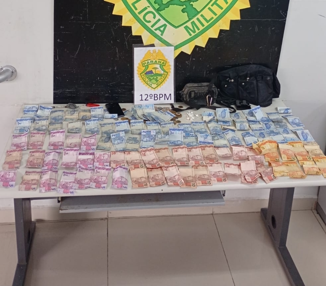 Em continuidade à ação, os policiais abordaram outro homem que saía do mesmo local, carregando duas pochetes. Dentro de uma delas, que estava parcialmente aberta, foi possível visualizar certa quantia em dinheiro. Na busca pessoal, a equipe localizou R$ 674,80 em espécie, quatro buchas de crack e dez buchas de cocaína.