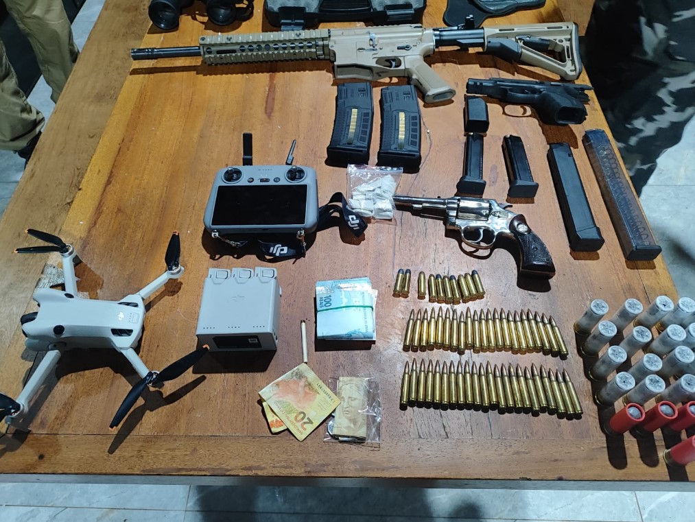 Durante o monitoramento, agentes da inteligência identificaram um homem armado no portão da casa. Diante da situação, foi solicitado o apoio da equipe CHOQUE do 14º Batalhão, que realizou a abordagem e prendeu três indivíduos. Na revista ao imóvel, foram encontradas diversas armas, munições e entorpecentes.