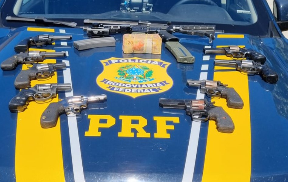 A Polícia Rodoviária Federal apreendeu um fuzil calibre 5.56, nove revólveres, três carregadores, uma mira holográfica e R$ 4.780 durante uma abordagem realizada na segunda-feira (5) em Londrina, no norte do Paraná.