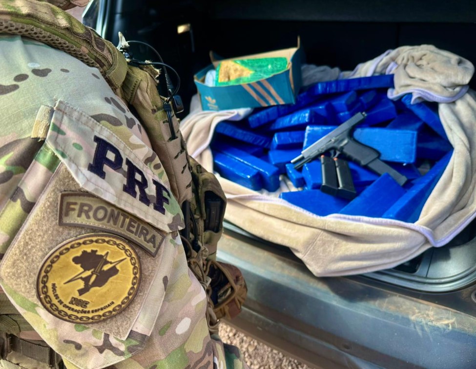 Durante a vistoria do veículo, os agentes encontraram diversos tabletes de maconha totalizando 94,36 quilos e 3,1 quilos de pasta base de cocaína escondidos no assoalho e no porta-malas. Além da droga, foi apreendida uma pistola Glock G17 equipada com kit rajada e três carregadores.