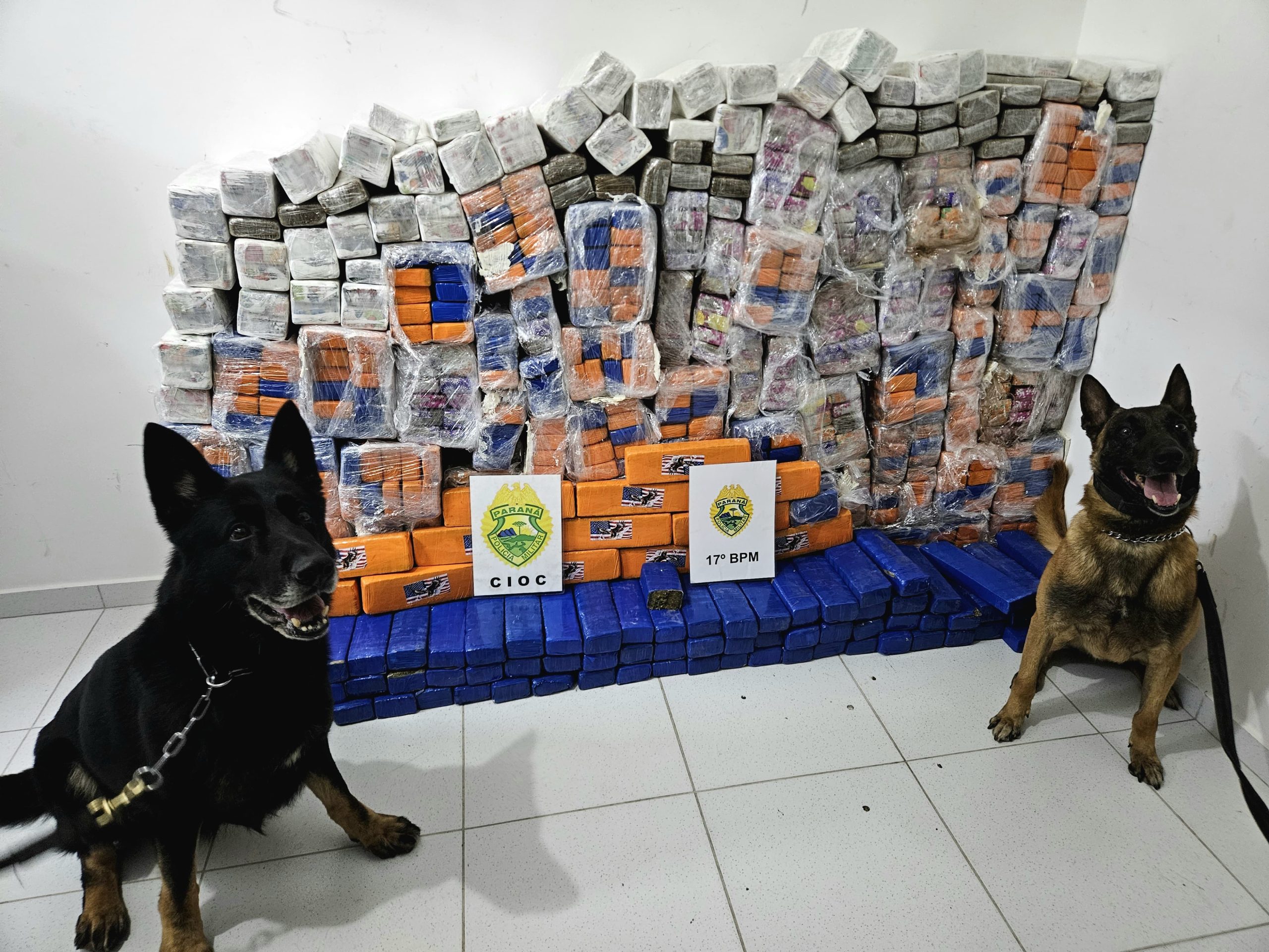 Uma ação do 17º Batalhão da Polícia Militar resultou na apreensão de 597,66 quilos de maconha na tarde deste domingo (30), após funcionários de um depósito no bairro Rio Pequeno, em São José dos Pinhais, encontrarem tabletes da droga dentro de caixas que eram descarregadas de uma carreta. A ocorrência mobilizou equipes da 1ª Companhia e o efetivo especializado da CIOC, Companhia Independente de Operações com Cães.