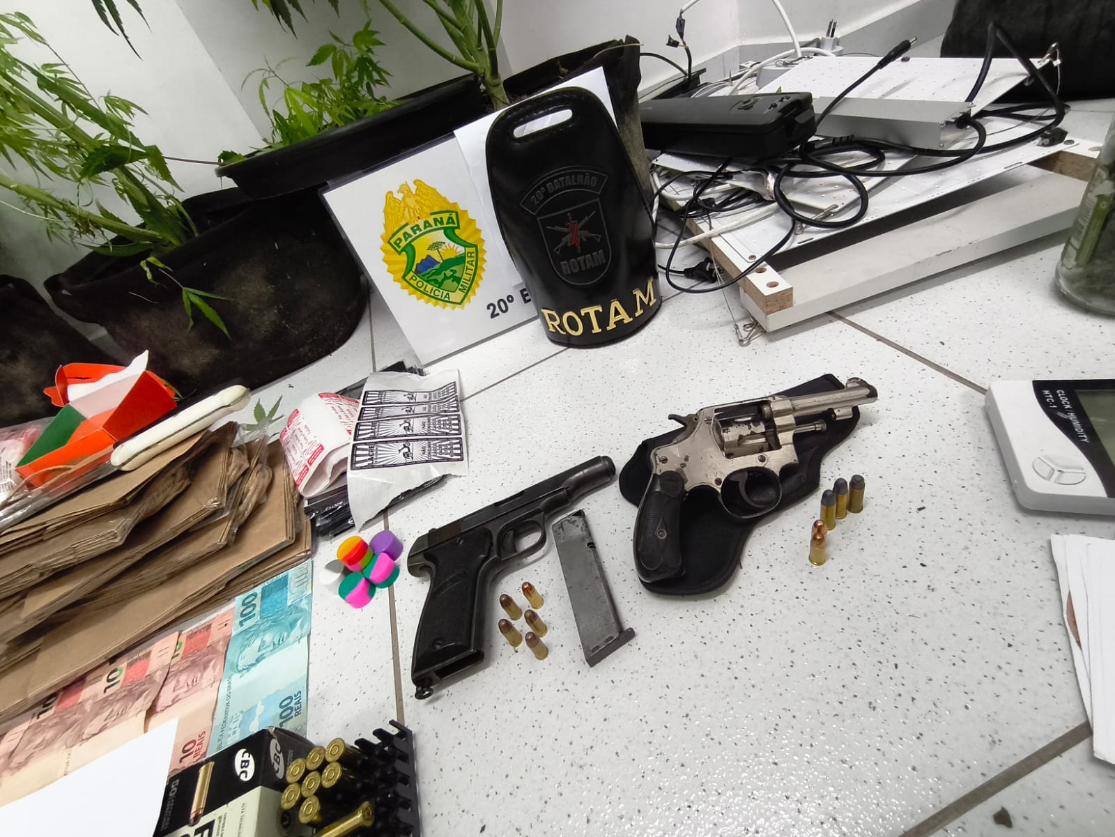 Durante as buscas, os policiais localizaram aproximadamente cinco quilos de maconha, uma estufa com cerca de 11 pés da planta, um revólver calibre .32 municiado, além de munições de diferentes calibres e materiais utilizados para preparo e embalagem das drogas.