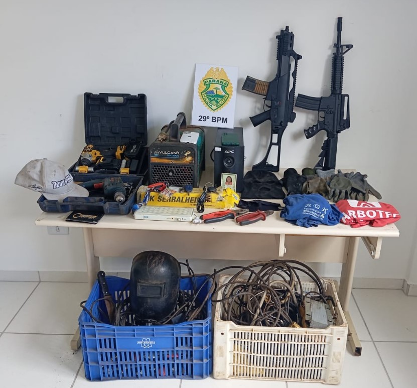 Durante a continuidade das diligências, em outro imóvel no mesmo bairro, as equipes localizaram dois simulacros de fuzil do tipo airsoft, que possivelmente foram utilizados na ação criminosa, além de outros objetos ligados ao roubo.