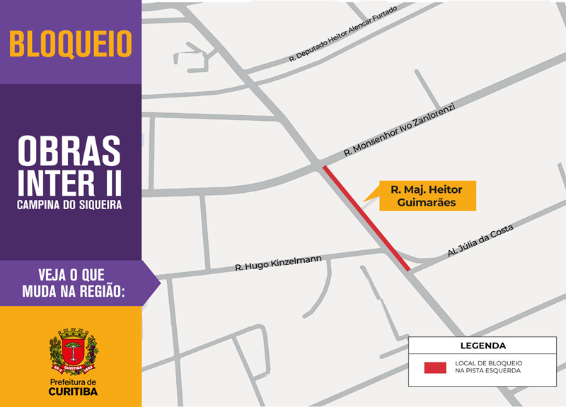 Nesta segunda-feira (6/4), a partir das 9h, a Rua Deputado Heitor Alencar Furtado estará com bloqueio total no trecho entre a Rua Hildebrando Cordeiro e a Major Heitor Guimarães, para realização das obras do Lote 1 do Novo Inter 2, no bairro Campina do Siqueira.